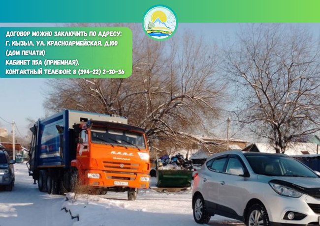 Договор на оказание услуг по обращению с твердыми коммунальными отходами, можно заключить по адресу: г. Кызыл, ул. Красноармейская, д.100 (Дом печати) кабинет 115А (приемная), контактный телефон: 8 (394-22) 2-30-36.